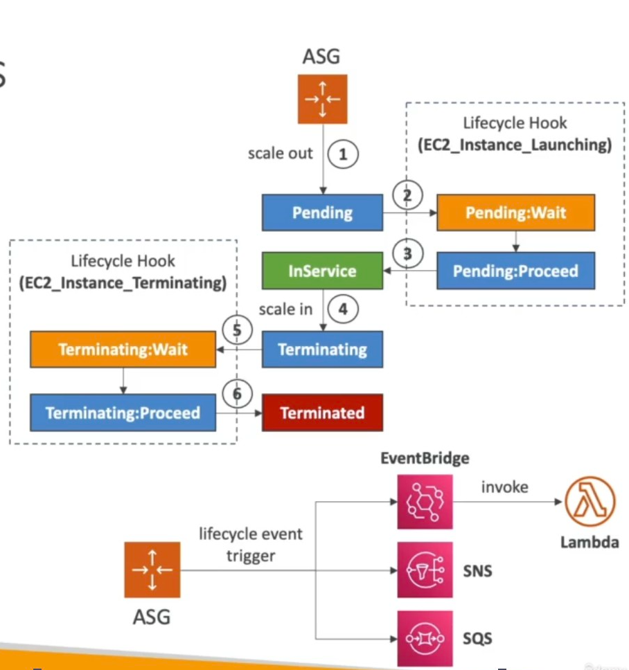 There are hooks that we can use, to define custom logic in between an ASG instance lifecycle, also integrated with event bridge for us to integrate with event driven services