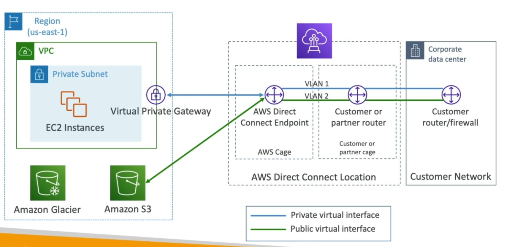 - Public VIF: To access AWS public services (e.g., S3, DynamoDB).