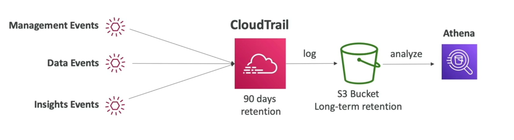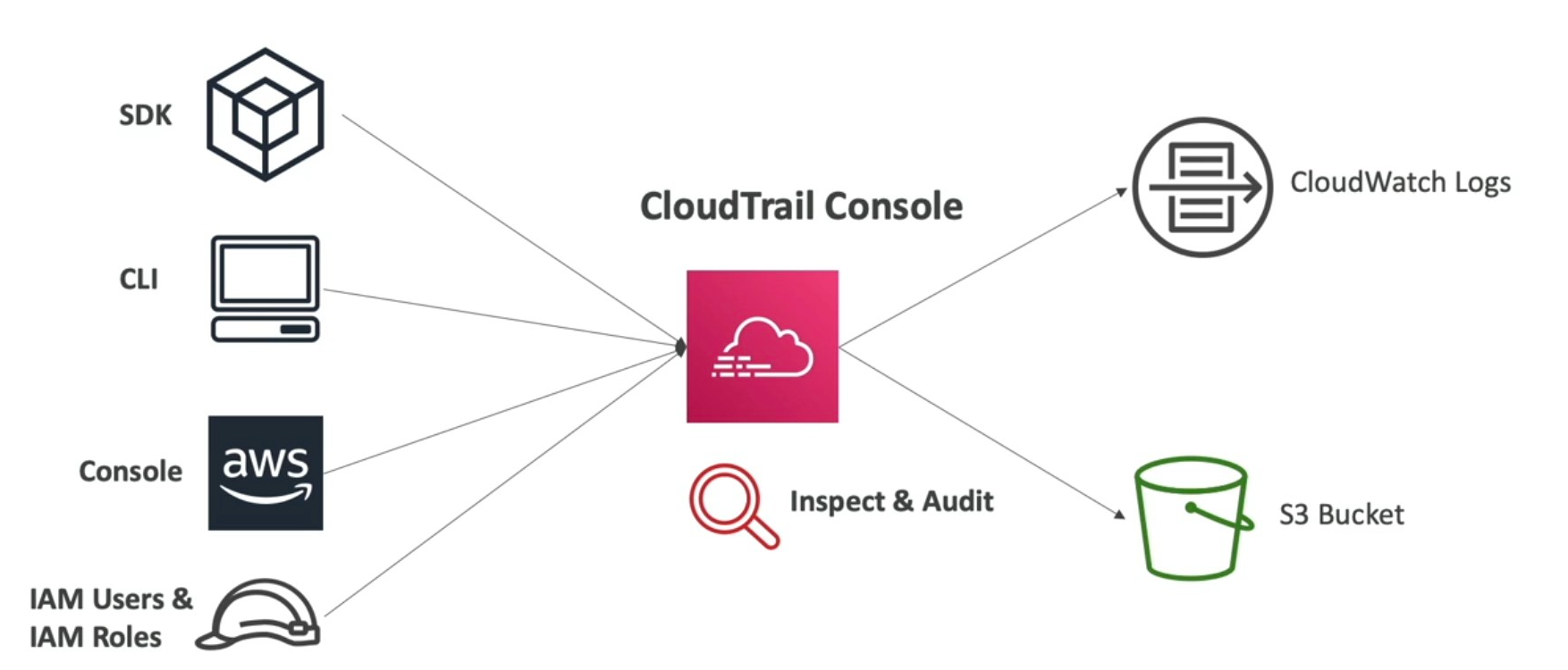 Cloudtrail events can be injected into cloudwatch logs or s3