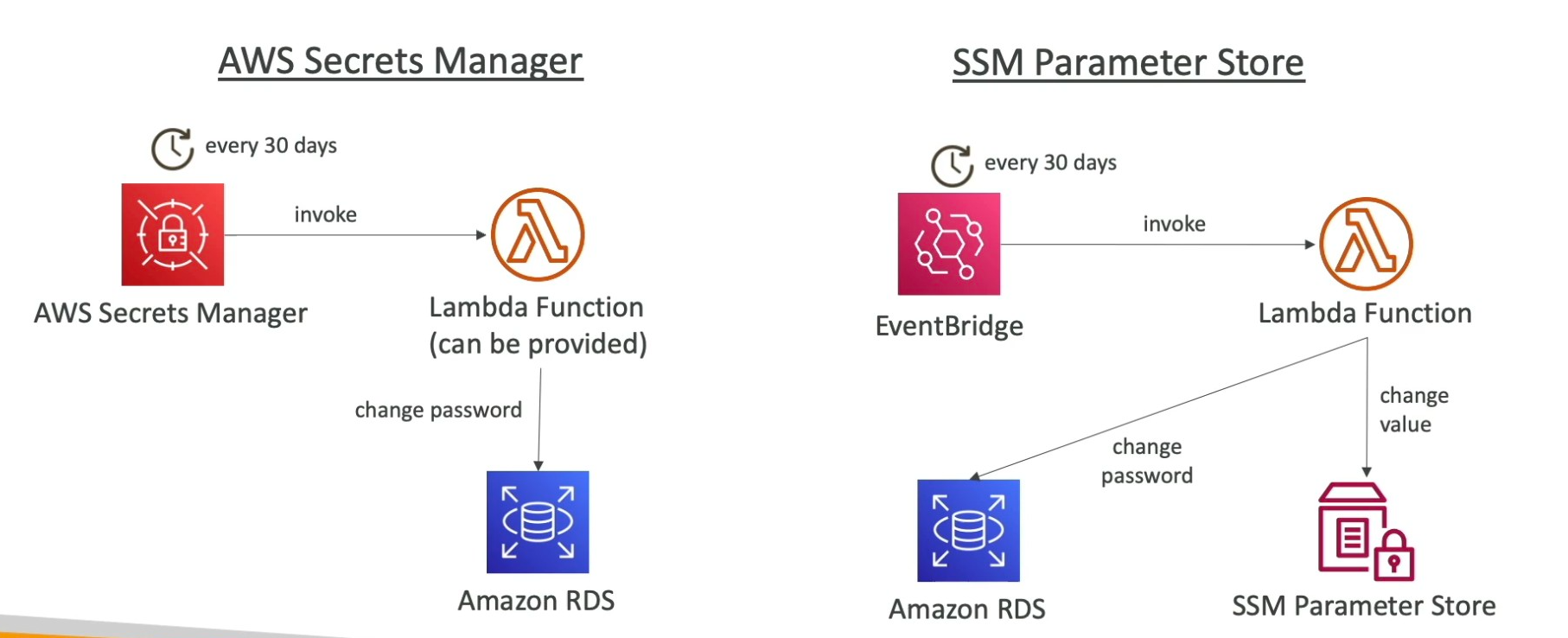 | Encryption | Mandatory encryption with KMS | Optinal via KMS (SecureString Type) |