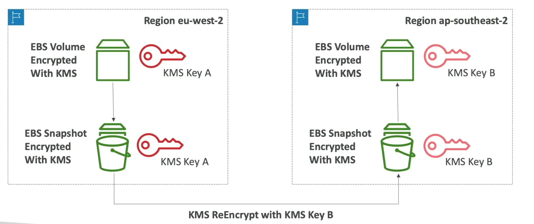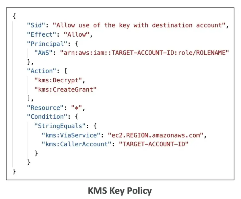- Create a copy from the snapshot in the target account with a cmk in that account