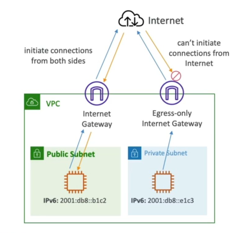 Since ipv6 is vast, we don’t need that, that’s why egress only internet gateway exists, you could also use an iGW if you prefer allowing inbound.